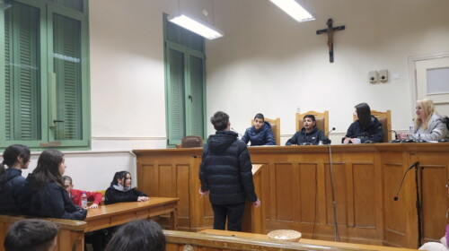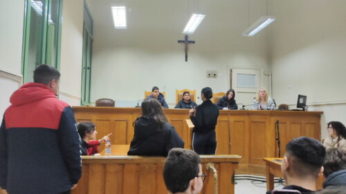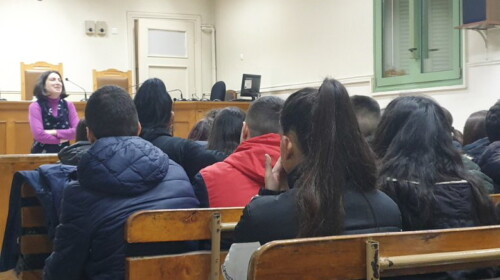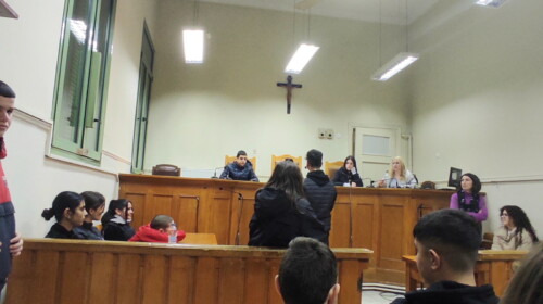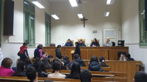Ακολούθως οι μαθητές/τριες έλαβαν μέρος σε εικονική δίκη, με θέμα την προστασία προσωπικών δεδομένων, αναλαμβάνοντας ρόλους με την καθοδήγηση των επιμελητριών κ. Χατζηβασιλείου και κ. Πέτσα, ώστε να κατανοήσουν βιωματικά τον τρόπο που λειτουργεί η απονομή δικαιοσύνης και τα αναμορφωτικά μέτρα που εφαρμόζονται στους ανήλικους παραβάτες.