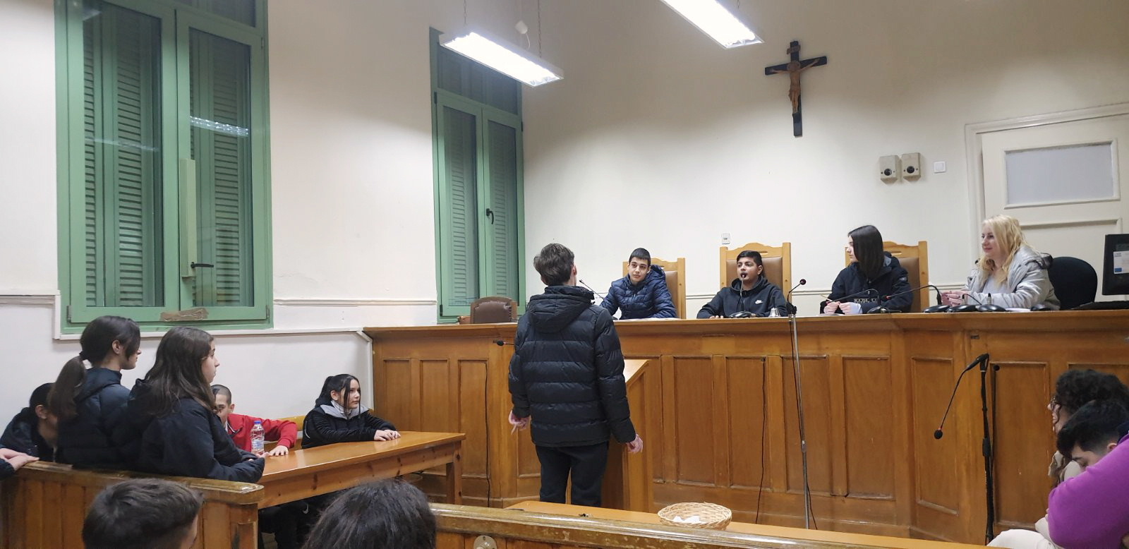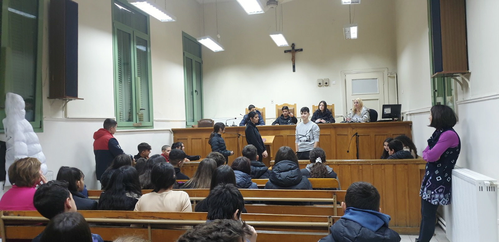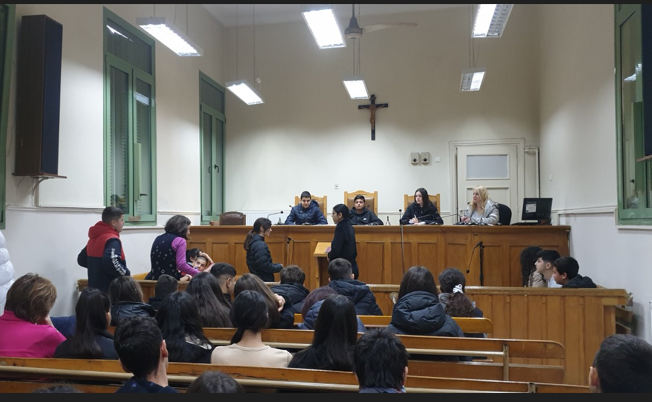 Ακολούθως οι μαθητές/τριες έλαβαν μέρος σε εικονική δίκη, με θέμα την προστασία προσωπικών δεδομένων, αναλαμβάνοντας ρόλους με την καθοδήγηση των επιμελητριών κ. Χατζηβασιλείου και κ. Πέτσα, ώστε να κατανοήσουν βιωματικά τον τρόπο που λειτουργεί η απονομή δικαιοσύνης και τα αναμορφωτικά μέτρα που εφαρμόζονται στους ανήλικους παραβάτες.