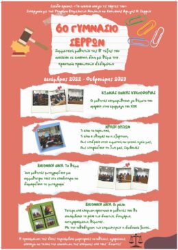 Την Δευτέρα 12 Δεκεμβρίου πραγματοποιήθηκε διδακτική επίσκεψη μαθητών και μαθητριών της Β’ τάξης του σχολείου μας στην Υπηρεσία Επιμελητών Ανηλίκων και Κοινωνικής Αρωγής Ν. Σερρών στο πλαίσιο εφαρμογής του Σχεδίου Δράσης: «Το σχολείο ανοίγει τις πόρτες του» .