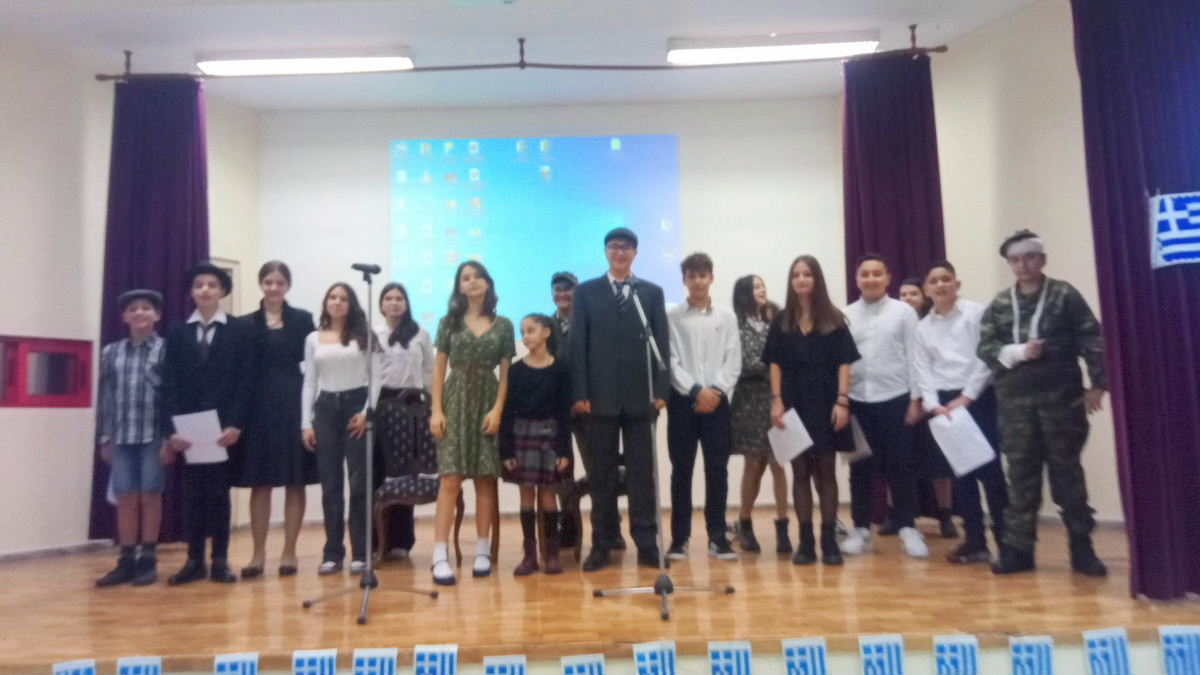 Την Παρασκευή, 27 Οκτωβρίου, πραγματοποιήθηκε εκδήλωση στο αμφιθέατρο του σχολείου μας για το Έπος του ’40. Ξεκίνησε με τη γιορτή της Σημαίας και τον ορισμό σημαιοφόρου και παραστατών. Ακολούθησαν απαγγελίες πεζών και ποιημάτων, αφήγηση των γεγονότων της εποχής και θεατρικό με τίτλο ” Οι καμπάνες του ’40”, πλαισιωμένα με οπτικοακουστικό υλικό και τραγούδια από την πολυμελή χορωδία του σχολείου. Η εκδήλωση ολοκληρώθηκε με την απονομή βραβείων και αριστείων στους μαθητές που αρίστευσαν το προηγούμενο σχολικό έτος.