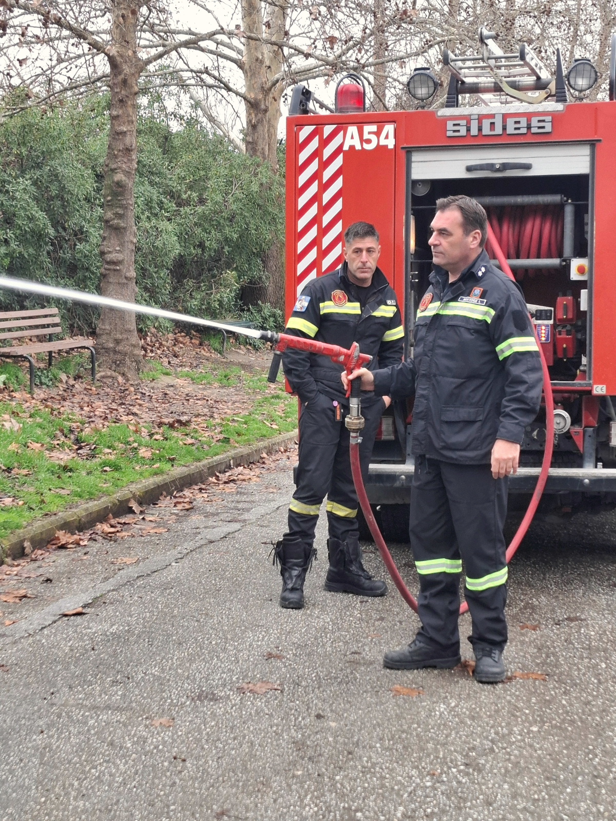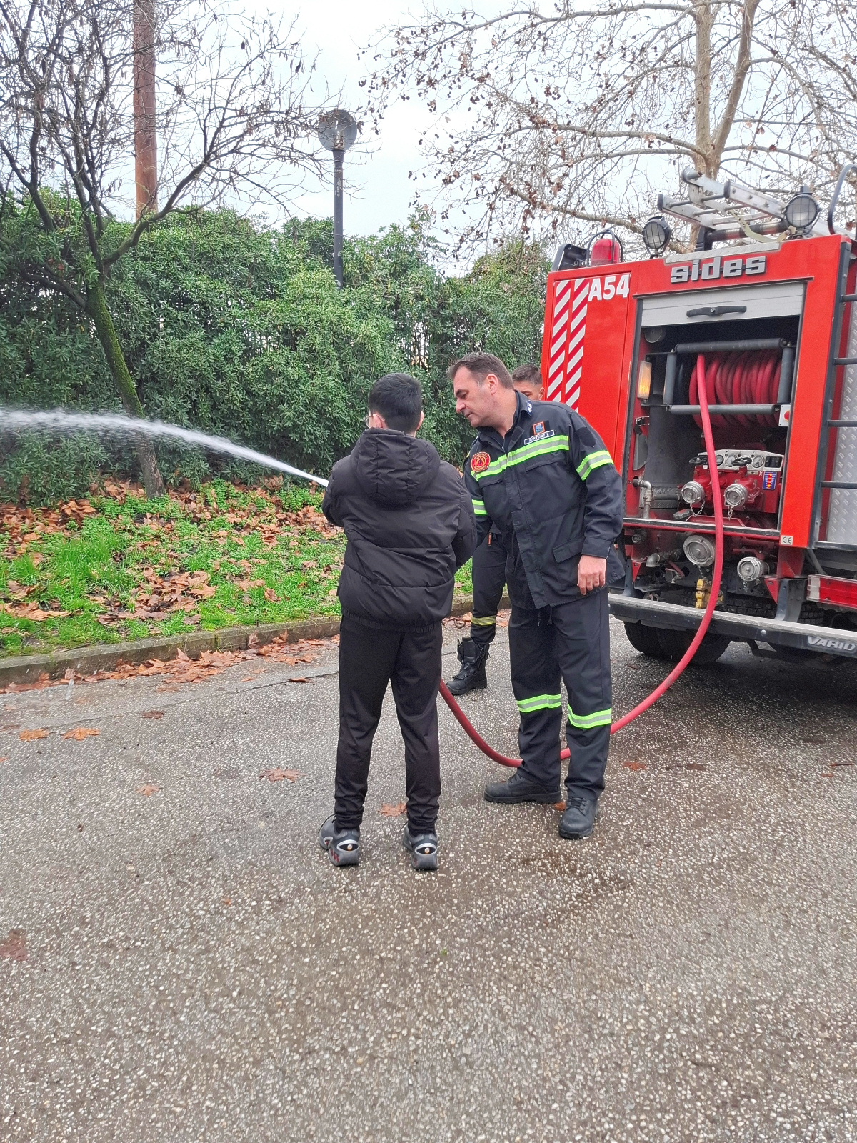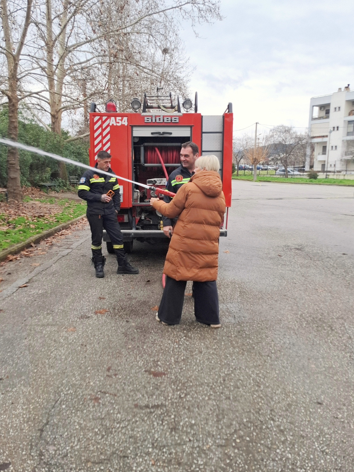 Η επίσκεψη έκλεισε με τον πιο εντυπωσιακό τρόπο: μια μικρή επίδειξη ρίψης νερού στην αυλή, που γέμισε χαμόγελα και χειροκροτήματα όλο το σχολείο!