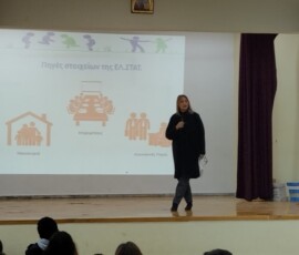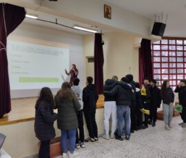 Παρακολουθήσαμε μια ενδιαφέρουσα εισήγηση από την προϊσταμένη του τμήματος η κ. Λιάτσα. Ακολούθησαν βιωματικά παιχνίδια από την κ. Ασημάκη, στα οποία οι μαθητές της Γ’ ανταποκρίθηκαν με ενθουσιασμό. Ήταν μια ξεχωριστή παρουσίαση που μας άφησε πολλές θετικές εντυπώσεις.